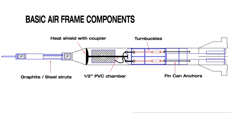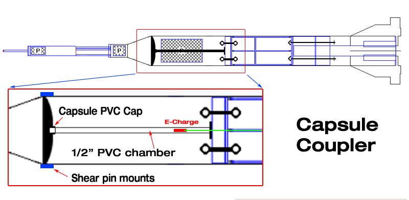 1 gram BP main decoupling charge in a 1/2" x 19" pvc pipe. This charge holds two Davey Fire e-matches (2001 A/N 28b), one from the main flight computer and one from the back-up flight computer.