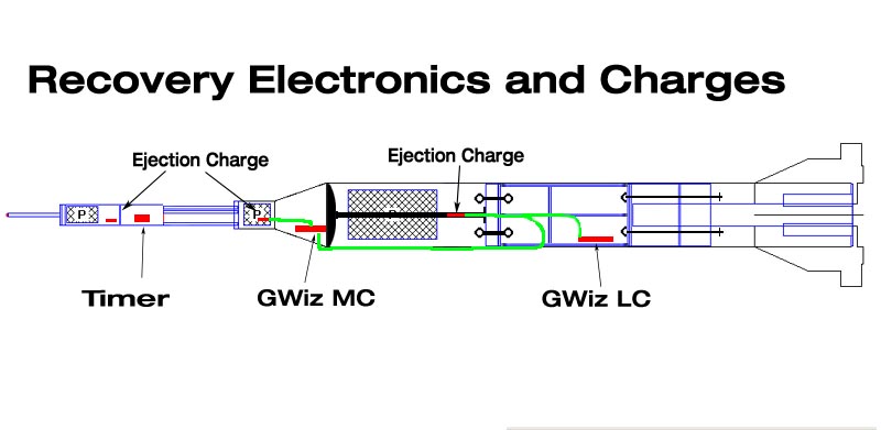 Booster - GWiz LC used as the primary flight computer for the booster and will fire the decoupling charge at apogee